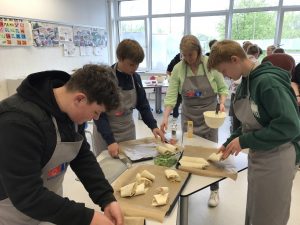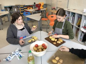 Auch Smashed Potatoes wurden gebacken und es wurde auch hierzu ein frischer, gesunder Dip hergestellt. Parallel waren die Schülerinnen und Schüler sehr interessiert daran, etwas über den Beruf des Kochs zu erfahren. Hierzu erzählte Arno Tessmer viel über seinen Werdegang, seine Ausbildungstätigkeit und die große Bedeutung eines guten Abschlusses für einen erfolgreichen Einstieg in die Berufswelt.