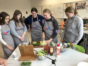 In der sich anschließenden Praxiseinheit durften die Schülerinnen und Schüler ran ans Messer: So wurde der korrekte Umgang mit dem Messer gezeigt, um Gemüse in feinste Würfel zu schneiden. Diese Vorarbeit war wichtig, um vegetarische Wraps mit selbst gemachtem Dip herzustellen. Dabei war von den Schülerinnen und Schülern darauf zu achten, dass sie die Wraps auch ansprechend anrichten.