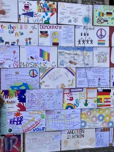 Aus diesen insgesamt 108 Kartons wurde durch das Organisationsteam um Jan Meyer eine „Mauer der Demokratie“ vor der Rathaustreppe aufgebaut, 38 Kartons davon haben unsere Klassen und Kurse der Jahrgänge 5-13 dazu beigetragen.