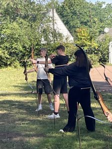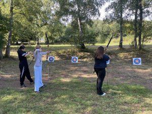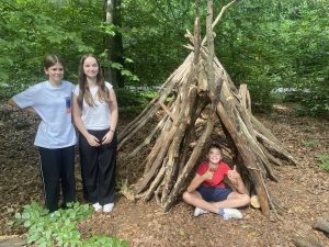 Alle Klassen versuchten sich beim intuitiven Bogenschießen – Konzentration, Achtsamkeit und Körpergefühl standen im Fokus. Unterschiedliche Aufgaben kamen bei der „Team Spirit Challenge“ auf die Klassen zu. Besonders eindrucksvoll war das Projekt der Klasse 8d: In geschlechtsübergreifenden Gruppen wurden kreative Häuser aus Totholz im Wald gebaut – ein tolles Beispiel für Zusammenarbeit, gegenseitige Unterstützung und Ausdauer. Alle neun Häuser wurden fertiggestellt und zum Abschluss präsentierten alle Gruppen auf kreative Art und Weise ihre Gebäude und ihre Funktion im großen Walddorf.
