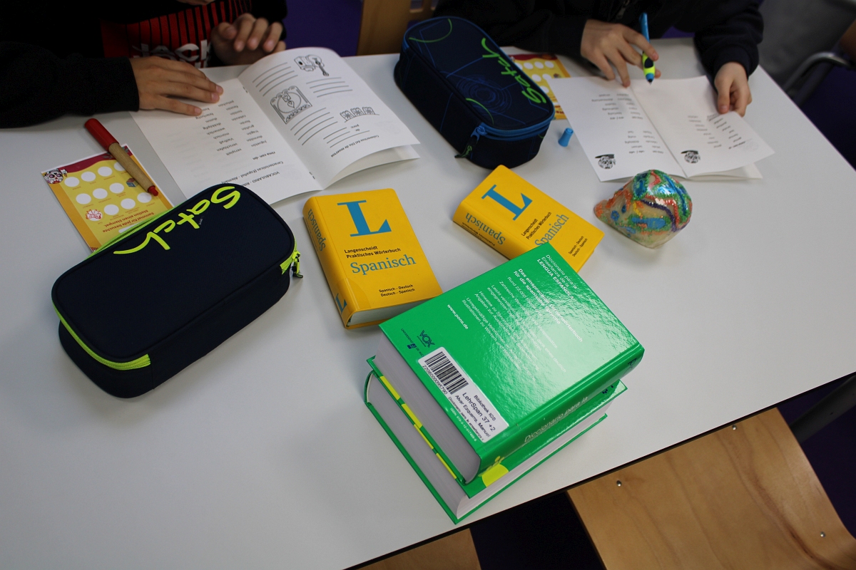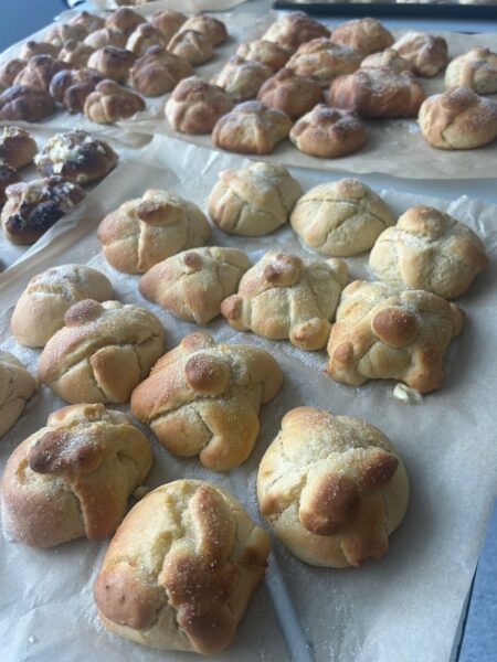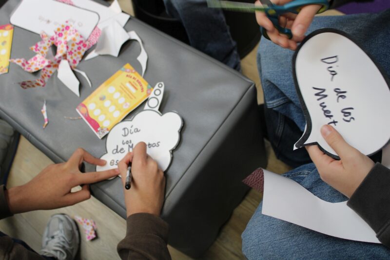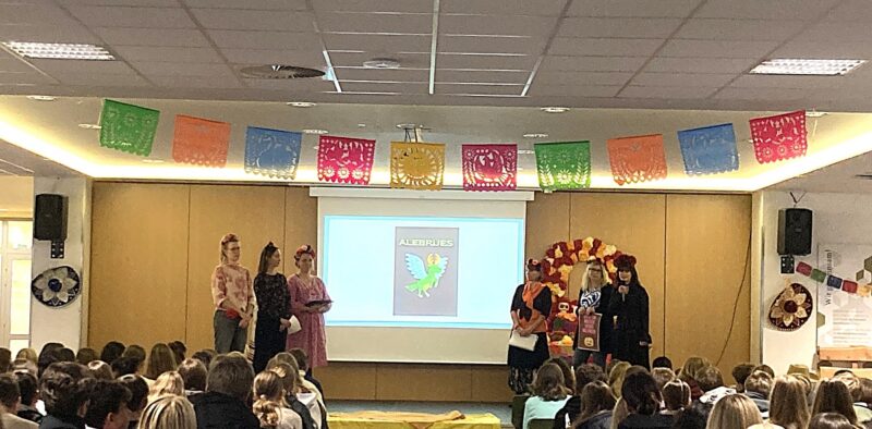 Die Fachschaft Spanisch freut sich über alle, die aktiv zum Gelingen des Festes beigetragen haben: Eine Mutter unterstützte die Bastelstationen, eine Schülerin präsentierte am Ende auf der Bühne echte indigene Kleidung aus Mexiko, zwei weitere hielten einen eigenen Reisevortrag auf Spanisch, andere trugen Verse der Calaveritas vor, eine Gruppe sang sogar den Coco-Song „El mundo es mi familia“ mit Mikrofon auf der Bühne und das selbst gebackene „Pan de Muerto“ wurde miteinander geteilt.
