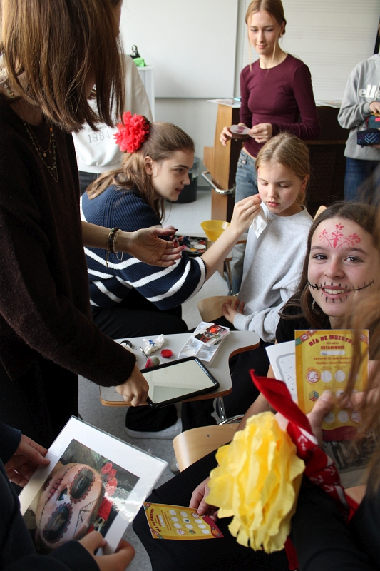 Nach der virtuellen Landung stellten die sechs Spanischlehrkräfte das Programm vor. An elf Stationen konnten die Schülerinnen und Schüler die Tradition, die Werte aus der vorspanischen Zeit der indigenen Bevölkerung der Azteken mit christlichem Glauben friedlich verbindet, mit allen Sinnen erleben. Besonders beliebt waren das Backen des „Pan de Muerto“ und das Jeopardy-Quiz zur Landeskunde. Für authentische Stimmung sorgten außerdem Schminkstation, Karaoke und bunte Bastelangebote in der Oberstufenmensa.