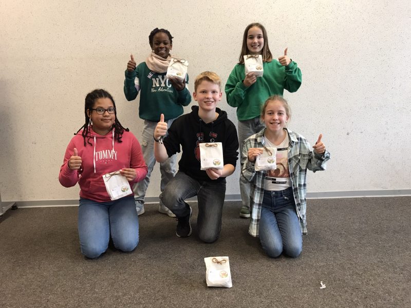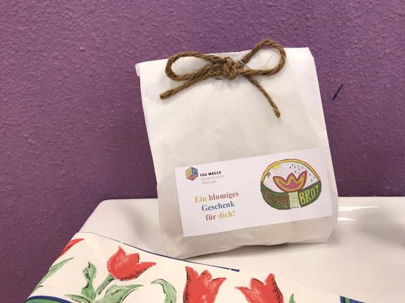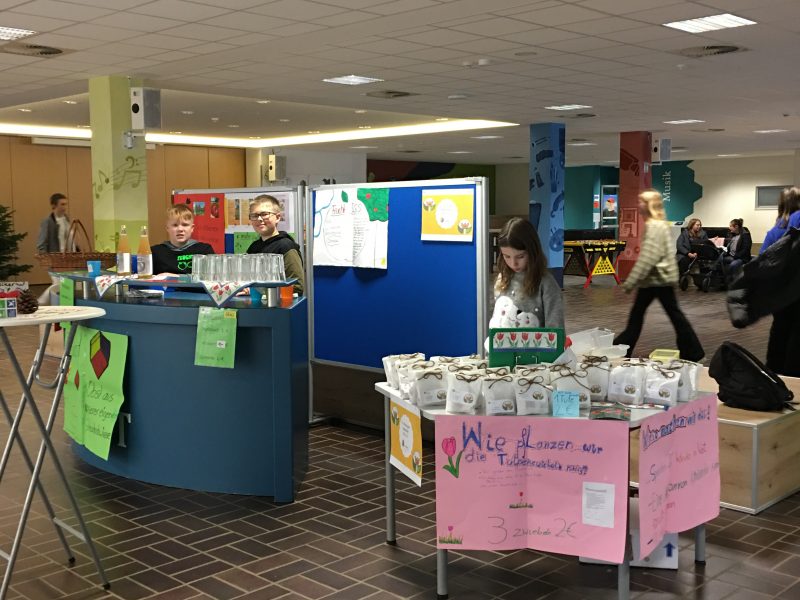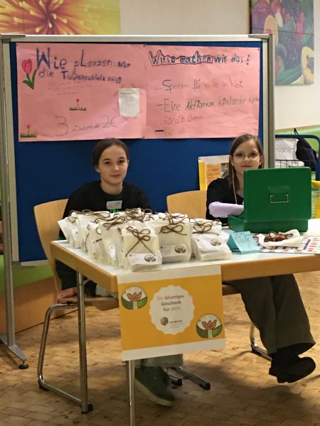250 Tulpenzwiebeln wurden von den Schülerinnen und Schülern der Nachhaltigen Schülerfirmen „Grüner Daumen“ und „FruchtIGS“ unter der Leitung von Melanie Cronshagen und Vera Remmers ansprechend verpackt. Die „blumigen Geschenke“ mit je drei Tulpenzwiebeln wurden für die Aktion „Tulpen für Brot“ sowohl auf dem Kinderkram-Basar, dem Elternsprechtag und unter den Lehrkräften verkauft. Dabei wurde ein Spendenbetrag von 175,00 Euro eingenommen.