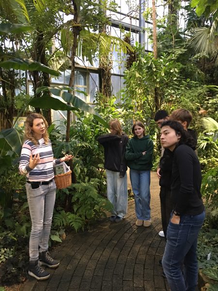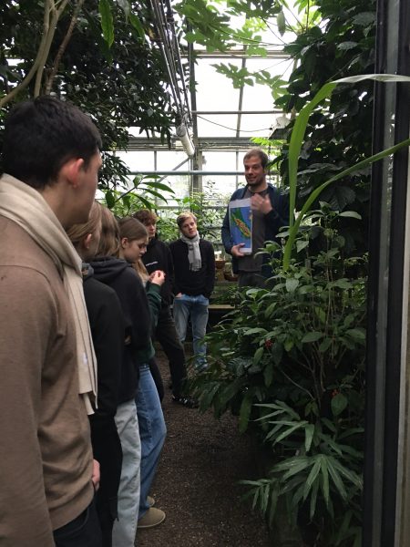 Die Universität forscht seit langem zu Costa Rica und die Schülerinnen und Schüler bekamen, geführt von Doktoranden, einen guten ersten Einblick in die Fauna Costa Ricas. Gezeigt wurde die tropische Pflanzenwelt, Nutzpflanzen der Tropen und speziell die Vegetation verschiedener Lebensräume in Costa Rica. Kakaobohnen wurden probiert und besondere Anpassungen der tropischen Pflanzen an die Bedingungen im Regenwald wurden besprochen, z.B. epiphytische Orchideen und Bromelien, die mit ihrer Strategie im Urwald die Konkurrenz um Licht bewältigen oder die Bullant-Akazie, welche Ameisen einen Lebensraum gibt, indem sie Dornen als Wohnräume, Nektarien und Proteine zur Ernährung anbietet, um dann im Gegenzug Schutz von den wehrhaften Ameisen vor Fressfeinden zu bekommen.