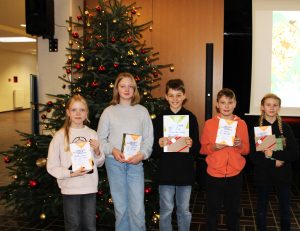 Mit Gutscheinen der Buchhandlung Sutmöller wurden die Plätze zwei bis vier belohnt, als Schulsieger nahm Philipp seinen Preis strahlend entgegen.